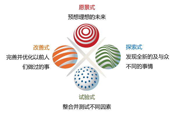 图一:企业可持续创新生存之道 正当我们对上述难题一筹莫展,无所适从的时候,威廉姆·米勒的研究成果却让我们眼前一亮,从1987年以来他和他的团队在全球诸多的企业中尝试用他的价值创新®方法论的实践,均取得了惊人与可喜的创新成果。而“创思行”(BeThinkAct™)就是他的研究成果之一。 “创”,米勒指出先把自己打造成一个具有创造性的人(Be Creative),企业中各级管理层以及其团队成员都应当具备创新的意识、树立创造性的价值观,以及积极良好的品格素质,这其中关于品格中的勇气相当重要。而作为企业的高层管理者更应该具备这些意识、价值观及品格,因为高层管理者无论在企业文化的塑造与变革方面,还是在企业战略决策方面都处在顶层设计的地位,起到引领及构建整个组织创新文化与创新实践的决定性作用。如前文所举例子,当企业决策层在分配其有限资源的时候,是否有勇气投资那些破坏性技术创新(但它可能带来颠覆性突破的创新成果)呢?因为这种投资明显不符合合理的财务决策。 “思”,指的是创新思维(Innovative Thinking),米勒认为我们每个人都有创造性的潜能,具备创造性思维,“问题不在于你能不能创新,而是你怎样创新”,为此他做了大量地研究并研发出了创新风格®(Innovation Style®)及其测评,以愿景式、改善式、探索式和试验式为四大基本创新风格,我们每个人都可以为创新做出贡献,同时各种风格也都有可能给创新带来阻碍。但是,无论最终的创新结果是渐进式的增量,还是颠覆式的突破都依赖于这四种不可或缺的创新思维。(图二)