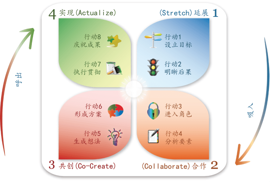 图二:四种创新风格®️ “行”,指的是创新行动(Action),米勒认为在一个组织中的团队创新应当是有一个普遍的行动流程的,创新之所以能产出成果(成就或获得新知识)是因为在创新之旅中存在着既有的科学和艺术,其中一系列伴着如同健康呼吸节奏一般的创新实践行动形成了一个动态的模型,它可以被应用到各种企业所面临的挑战中去。米勒较为成功地在这一系列行动中嵌入了对参与创新的人的关注度,其中包括对创新者们的目标导向力、风险意识、个人成就驱动力、洞察力、影响力等方面的关注,同时也非常关注在行动中对创新的团队氛围(Team Climate)的建设。(图三)